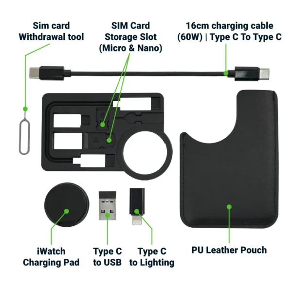 Premium Charging Cable Kit with 60W power capacity, featuring multiple ports including Type-C, USB, and Lightning, along with a 3W iWatch charging pad. Housed in a stylish PU leather pouch that includes storage slots for Micro and Nano SIM cards and a SIM card withdrawal tool — making it an all-in-one travel-ready accessory.